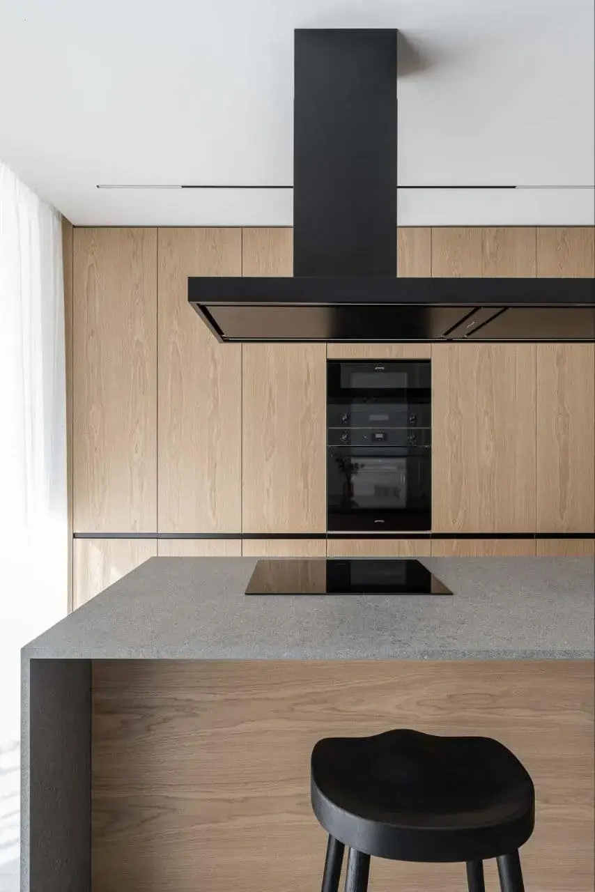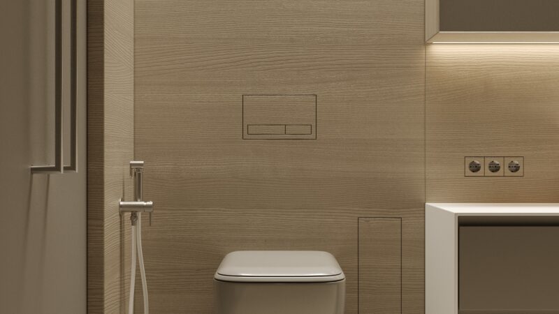 Sistemul de ventilație, butoanele și prizele sunt complet integrate în perete. Fără rame vizibile — doar o suprafață ceramică curată și mecanisme care rezistă ani de zile.